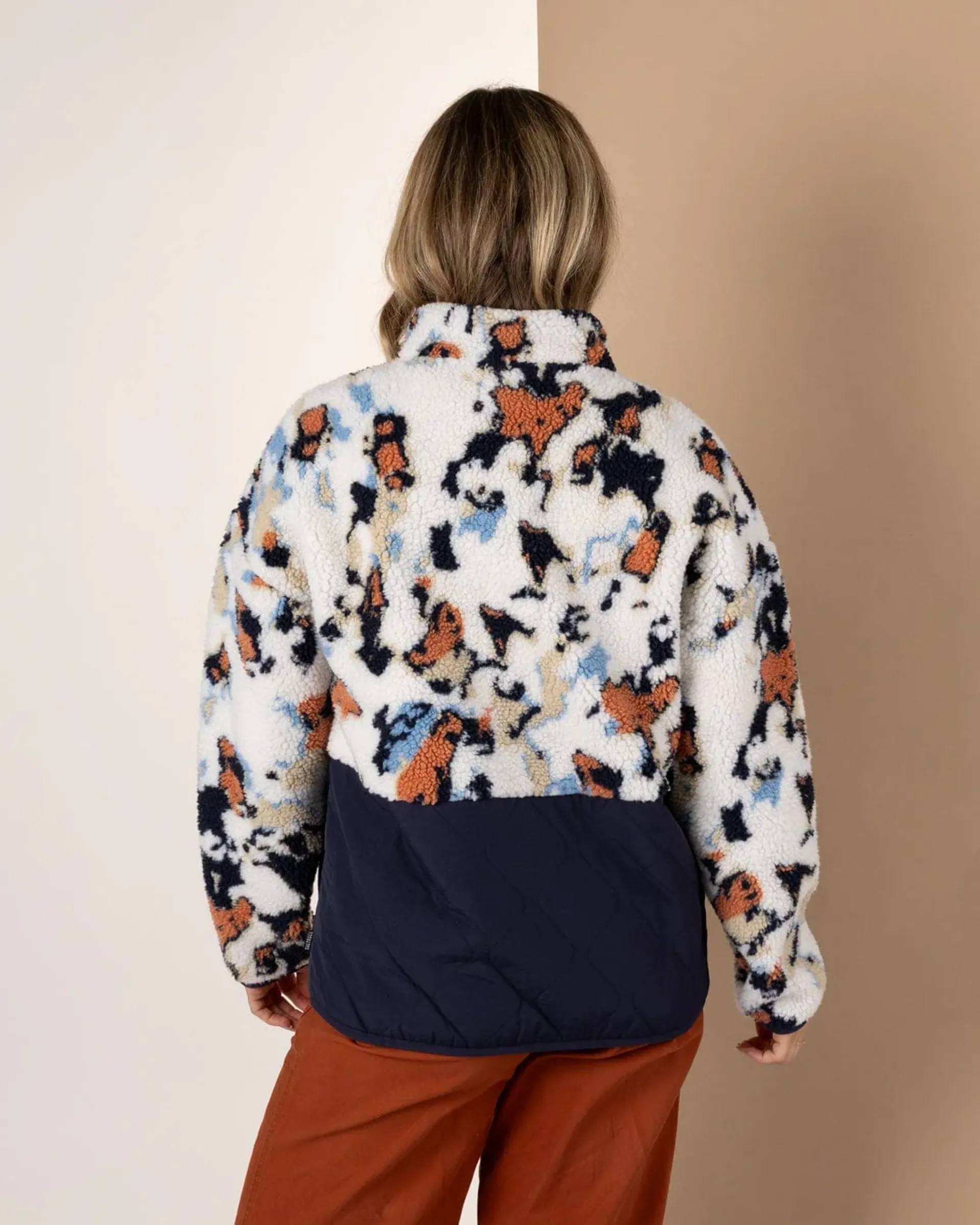 Standard-fit, full-zip fleece made from recycled materials, featuring a distinctive colour block design with a printed sherpa top body and a nylon quilted bottom